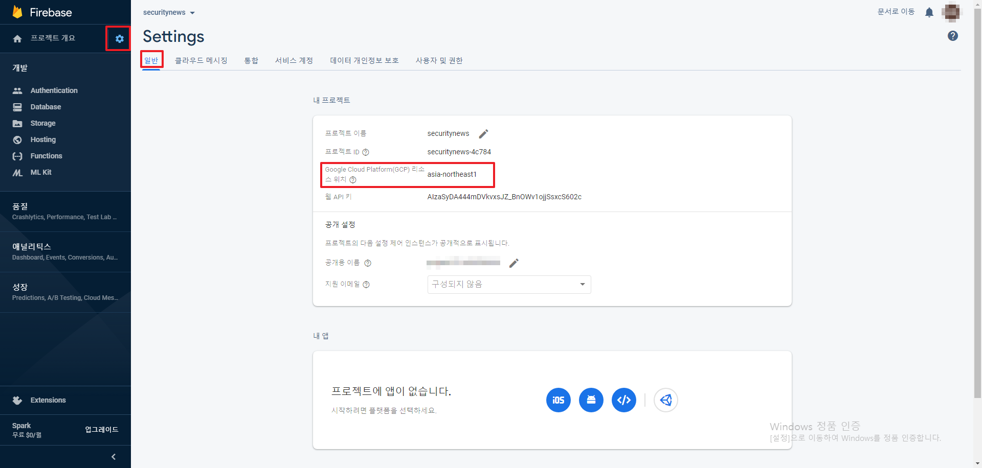 프로젝트 설정 > 일반 > Google CloudPlatform(GCP) 리소스 위치