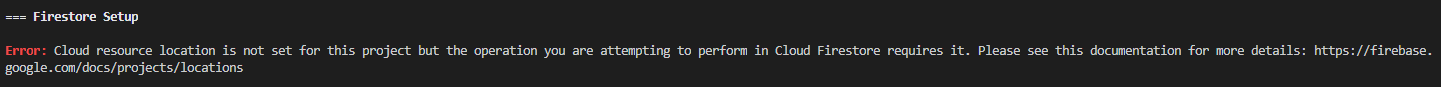 Error: Cloud resource location is not set for this project but the operation you are attempting to perform in Cloud Firestore requires it. Please see this documentation for more details: https://firebase.google.com/docs/projects/locations